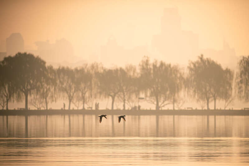 ↑水鸟在杭州西湖水面上飞翔(2023年12月26日)。 新华社记者 江汉 摄