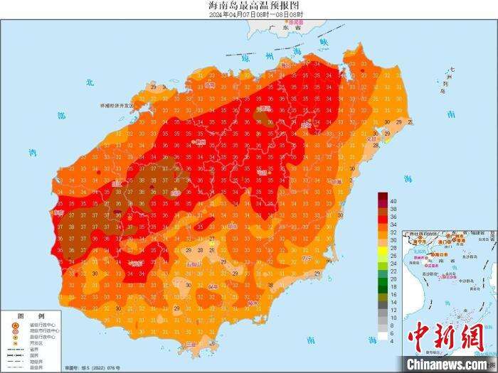 海南岛最高温预报图(2024年4月7日8时-8日8时)。海南省气象局制图