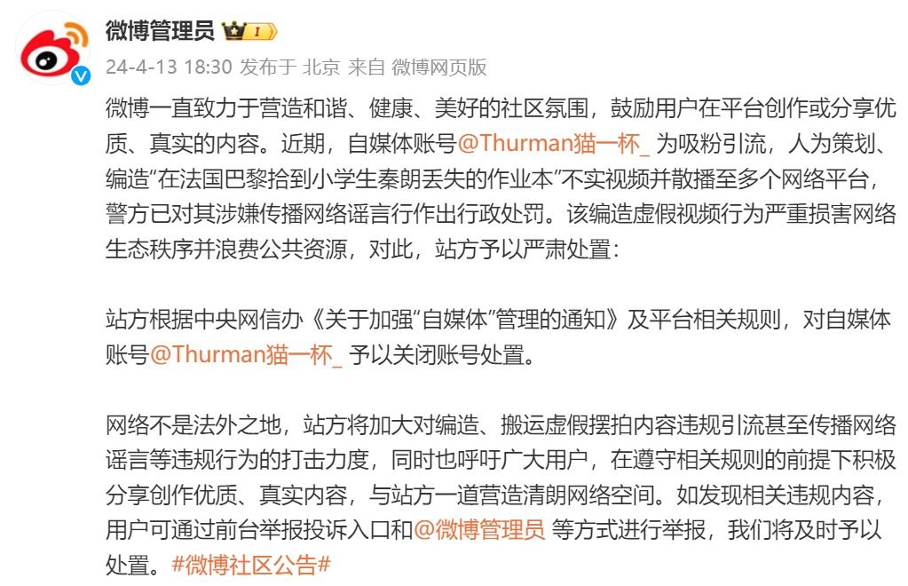 当天18时30分,@微博管理员 发布社区公告称,近期,自媒体账号@Thurman猫一杯_ 为吸粉引流,人为策划、编造“在法国巴黎拾到小学生秦朗丢失的作业本”不实视频并散播至多个网络平台,警方已对其涉嫌传播网络谣言行作出行政处罚。该编造虚假视频行为严重损害网络生态秩序并浪费公共资源,对此,站方予以严肃处置:站方根据中央网信办《关于加强“自媒体”管理的通知》及平台相关规则,对自媒体账号@Thurman猫一杯_ 予以关闭账号处置。
