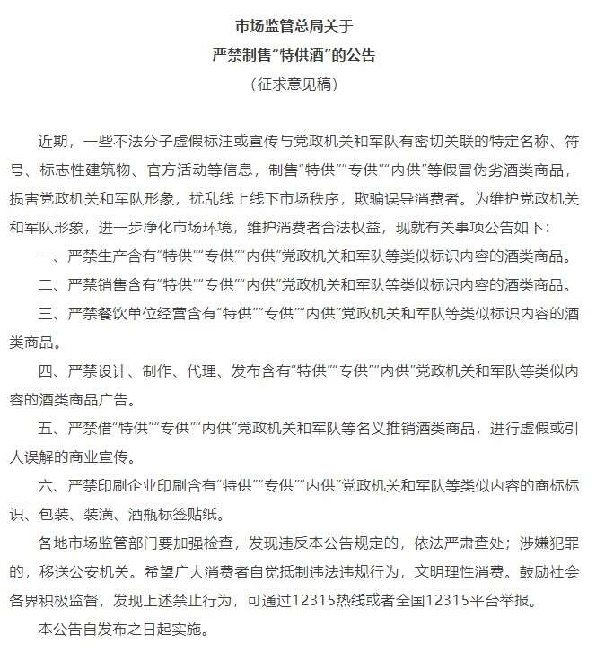 5月7日,市场监管总局发布《关于严禁制售“特供酒”的公告(征求意见稿)》(简称《征求意见稿》)。《征求意见稿》拟规定,对生产、销售、经营含有“特供”“专供”“内供”党政机关和军队等类似标识内容的酒类商品,以及发布相关广告、商业宣传等行为发出“禁令”。
