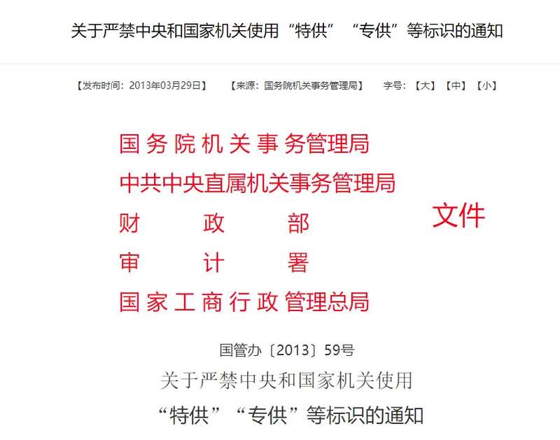 2013年,国务院机关事务管理局等5部门联合下发《关于严禁中央和国家机关使用“特供”“专供”等标识的通知》。