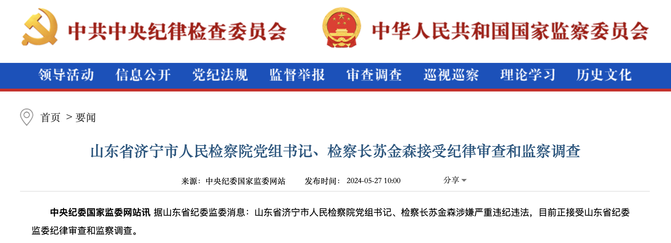 山东省济宁市人民检察院党组书记、检察长苏金森接受纪律审查和监察调查