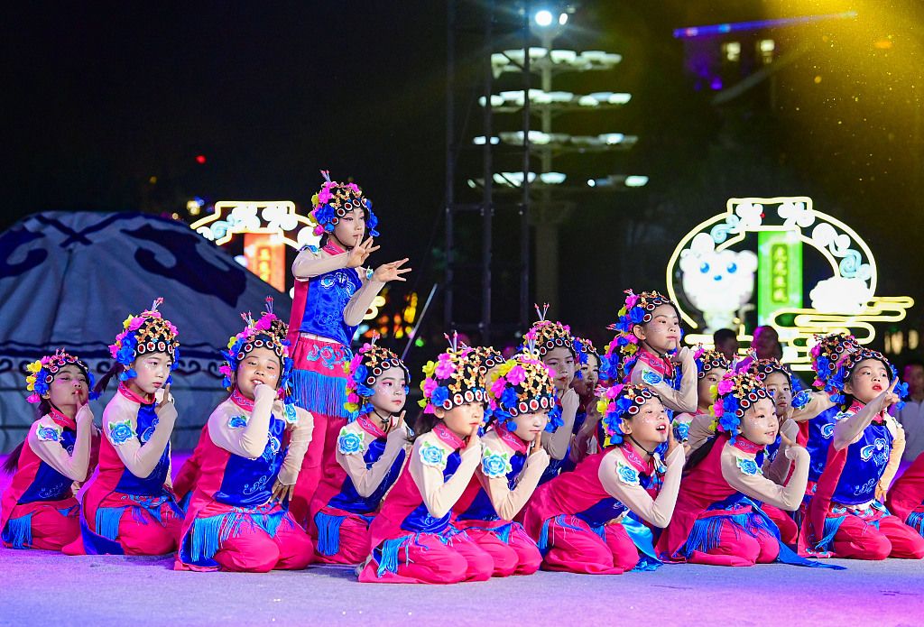 2024年6月1日,内蒙古鄂尔多斯,演员在鄂尔多斯市康巴什区百日消夏晚会中表演。近年来,内蒙古自治区鄂尔多斯市康巴什区持续推动公共文化服务平台建设,通过组织专业文艺团体和民间艺术能手进行社区公益演出,举办中心城区百日消夏晚会等方式,不断提高公共文化服务供给能力和服务水平,不断提升群众的获得感和幸福感。