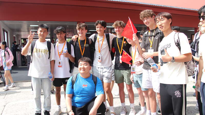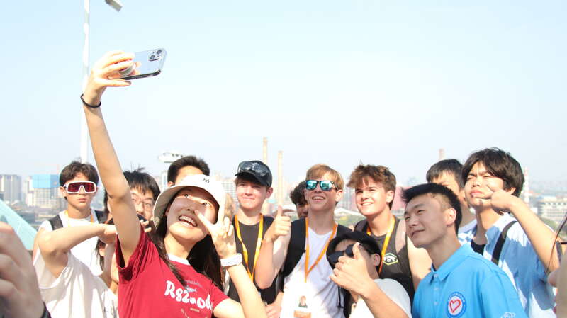 6月8日,北京,中美两国青少年代表在首钢滑雪大跳台起点处一起拍照打卡。中青报·中青网记者 王军利/摄