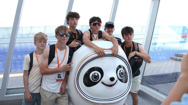 6月8日,北京,6名美国青少年和首钢滑雪大跳台内的“冰墩墩”一起合影留念。中青报·中青网记者 王军利/摄