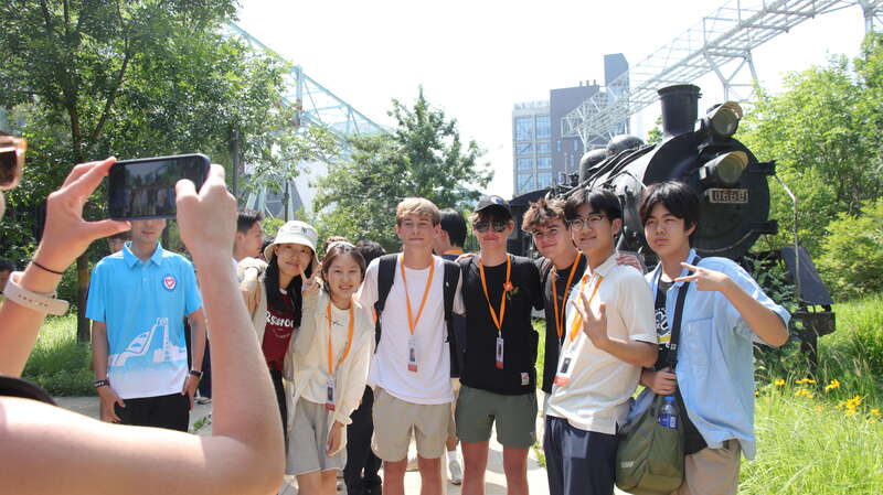 6月8日,北京,“未来之桥”中美青少年志愿服务交流活动首日,中美青少年在首钢园区废旧的火车头前拍照打卡。中青报·中青网记者 王军利/摄