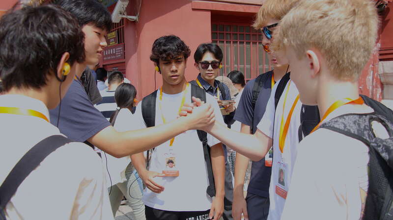 6月8日,北京,“未来之桥”中美青少年志愿服务交流活动首日,中美两国青少年代表交流握手礼仪。中青报·中青网记者 王军利/摄