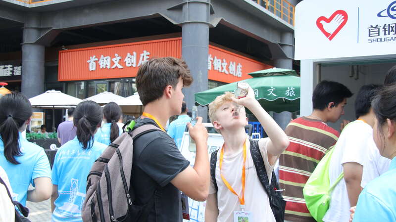 6月8日,北京,“未来之桥”中美青少年志愿服务交流活动首日,一位美国青少年正在品尝“首钢汽水”。中青报·中青网记者 王军利/摄