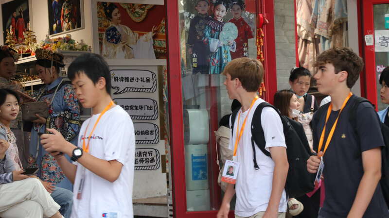 6月8日,北京,在“未来之桥”中美青少年志愿服务交流活动中,街头的传统服饰体验店吸引了美国青少年代表的目光。中青报·中青网记者 王军利/摄