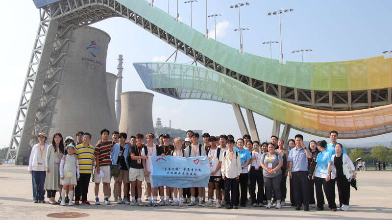 6月8日,北京,中美两国青少年代表在首钢滑雪大跳台前合影留念。“未来之桥”中美青少年志愿服务交流活动期间,来自北京中学在美友校的美国新泽西州格罗伦克高中的11名师生将共赴一场面向未来的、融合志愿服务与文化体验的青春志愿之旅。中青报·中青网记者 王军利/摄
