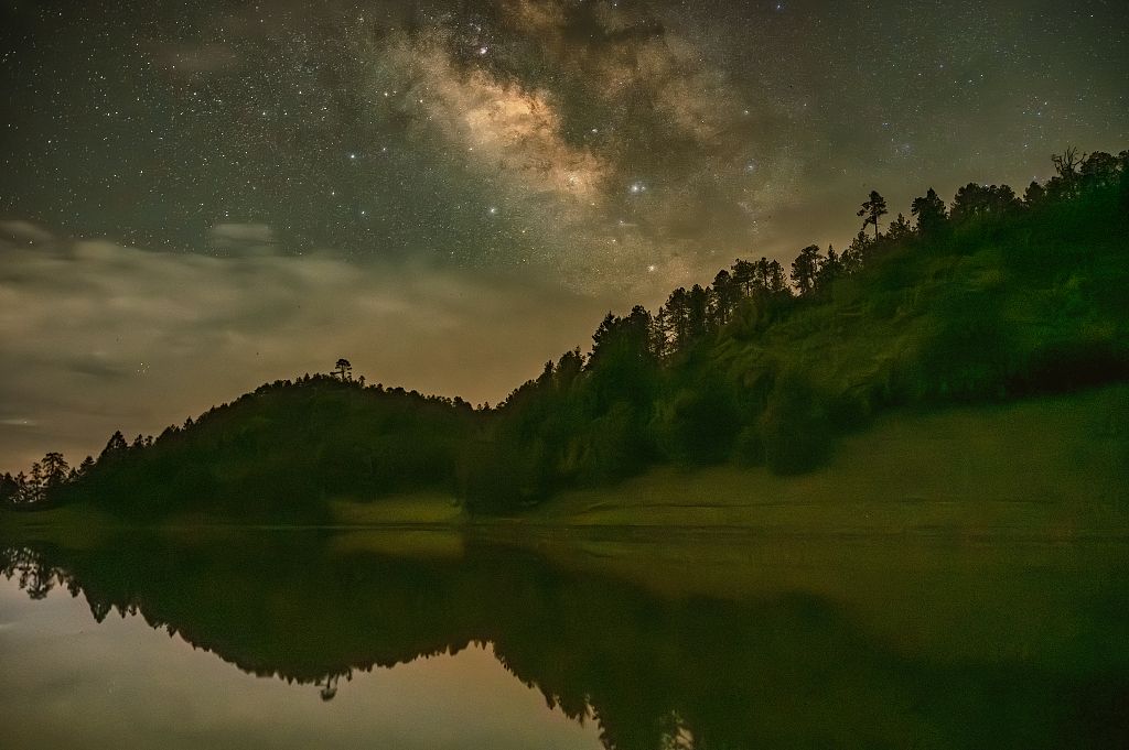 2024年6月8日,云南省怒江傈僳族自治州,兰坪县游玩富和山风景区雾湖倒映璀璨星空。