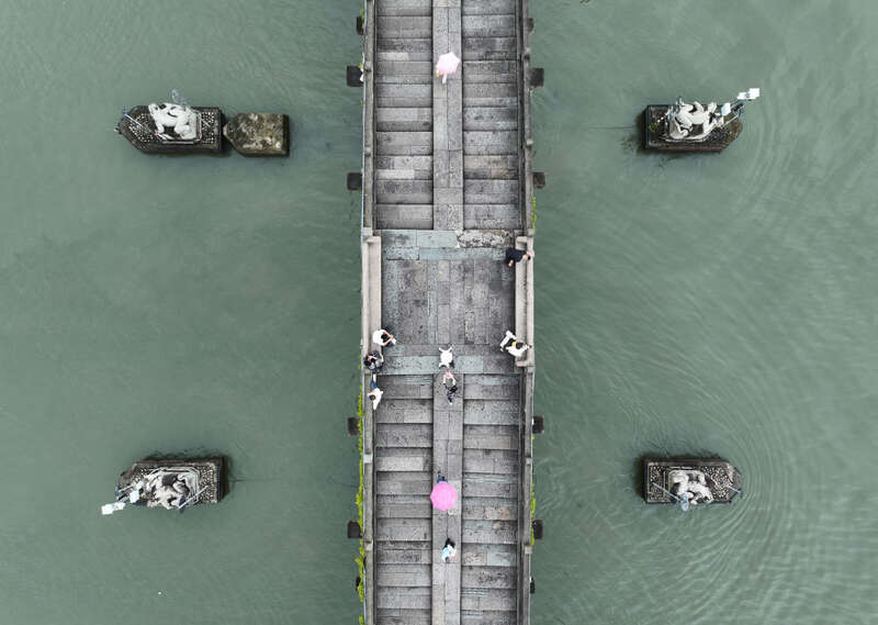6月12日,在杭州小河直街历史文化街区,游客在一座石拱桥上游玩(无人机照片)。