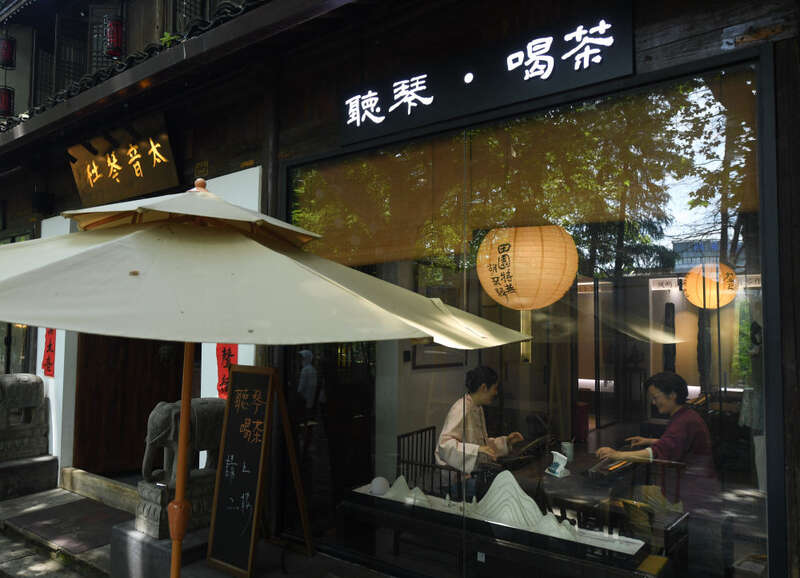 6月12日,在杭州大兜路历史文化街区的一家素食餐厅,客人在拍摄庭院的风景。