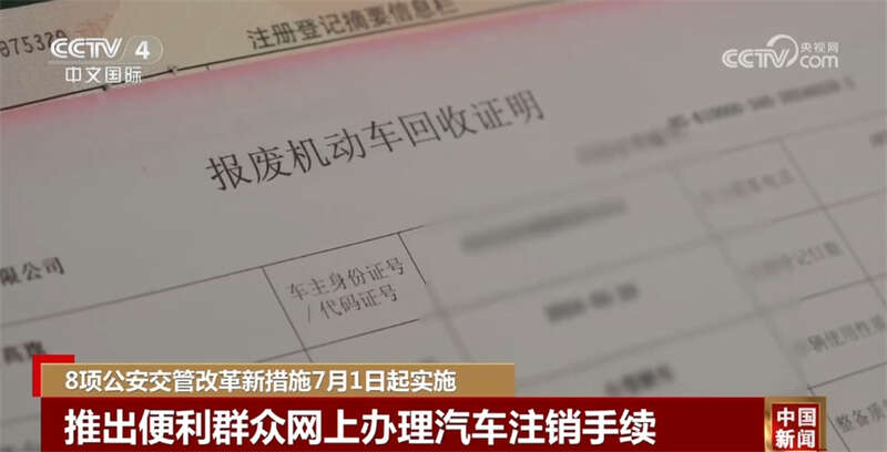 按照现行规定,车主向报废机动车回收企业交售报废车辆,申请注销登记后,需要到车管所窗口领取纸质机动车注销证明。从7月1日起,车主可以通过“交管12123”App网上下载机动车注销证明电子版,并可以使用电子版注销证明按照规定申请汽车以旧换新补贴资金。