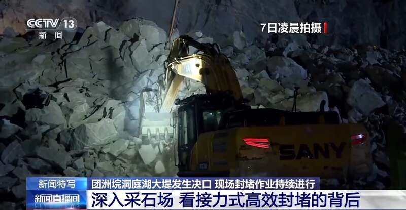 5分钟一辆装卸车 每天近8000吨石料运往洞庭湖决口封堵现场