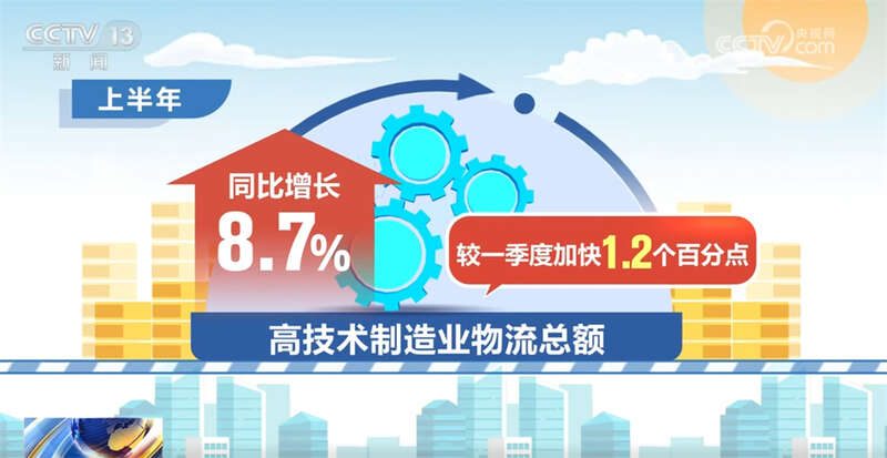 从物流结构看,上半年工业品物流总额同比增长5.8%。其中,高技术制造业物流总额同比增长8.7%,较一季度加快1.2个百分点。
