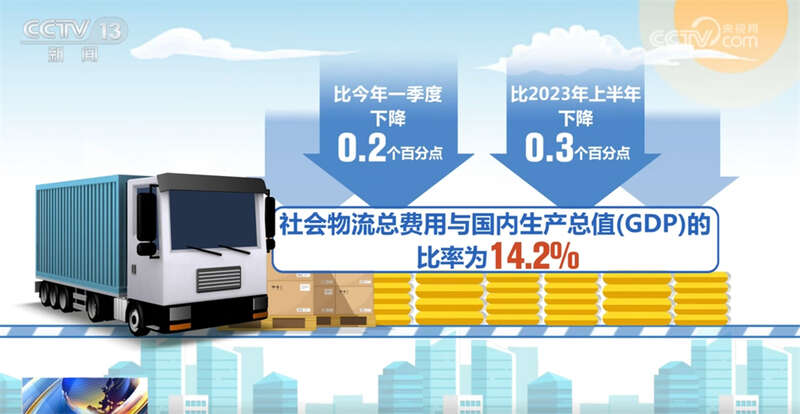 今年上半年,社会物流总费用为8.8万亿元,同比增长2.0%。社会物流总费用与国内生产总值(GDP)的比率为14.2%,比今年一季度和2023年上半年分别下降0.2和0.3个百分点。