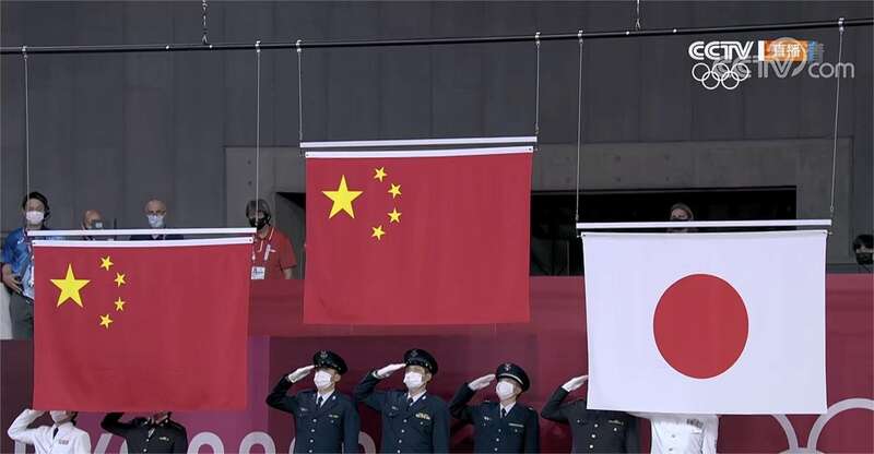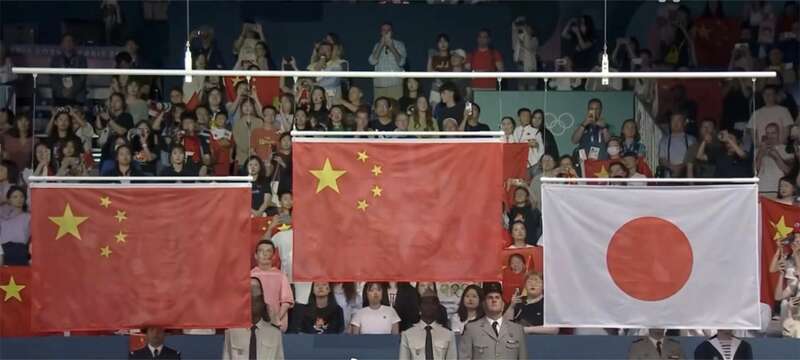 巴黎赛场同时升起两面五星红旗