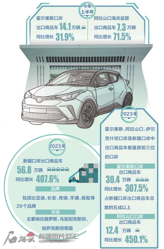 2023年,新疆口岸出口商品车56.8万辆,同比增长407.6%;出口品牌包括比亚迪、长安、奇瑞、宇通、极氪等29个,主要销往俄罗斯、乌兹别克斯坦、哈萨克斯坦等国家。