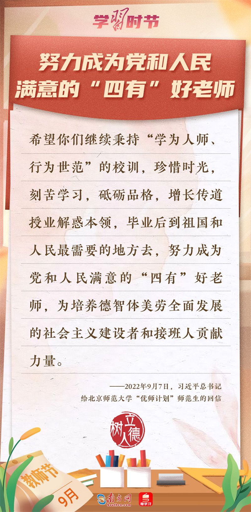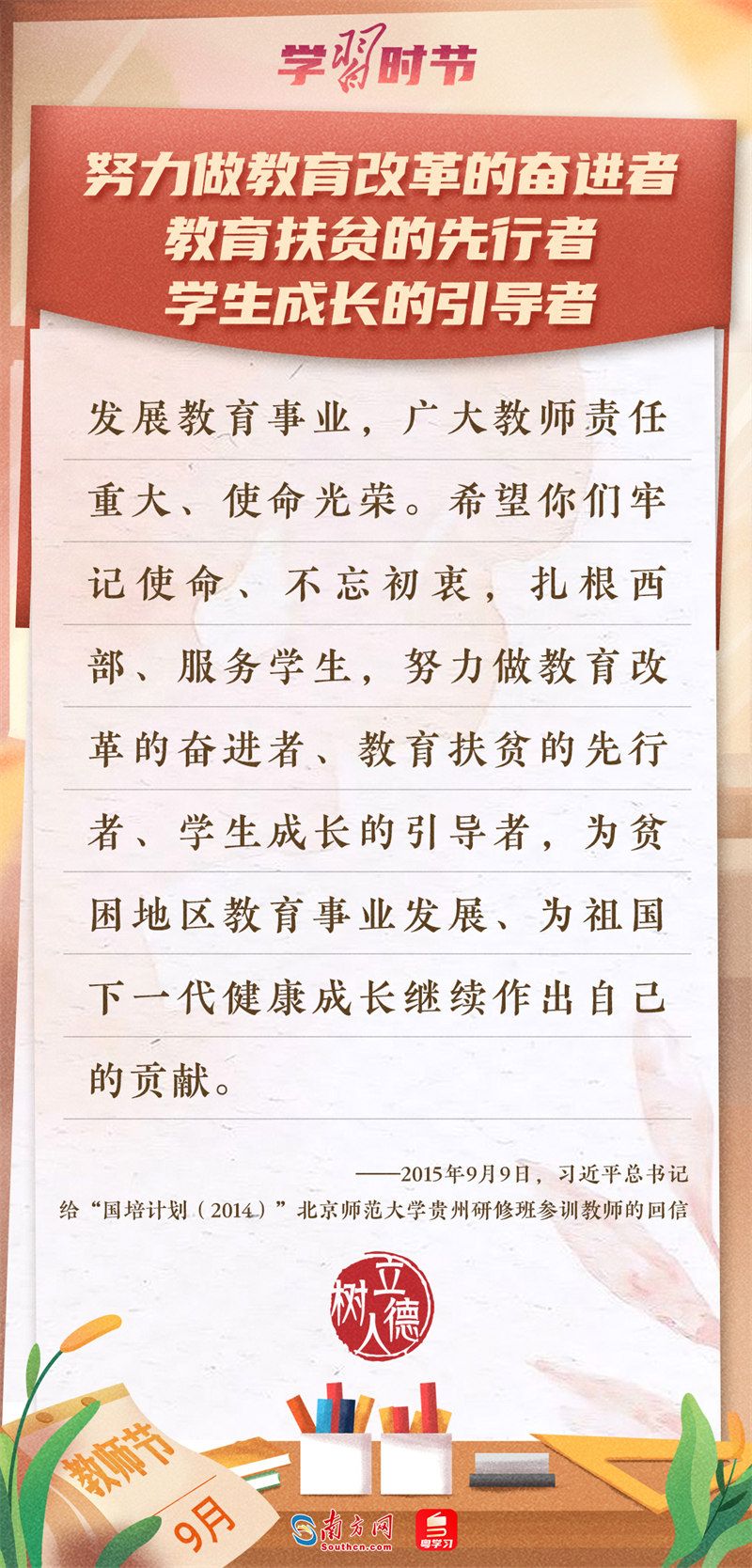 “百年大计,教育为本。教育大计,教师为本。”党的十八大以来,习近平总书记多次以书信形式向教师群体和教育工作者表达嘱托与期望,谆谆话语,催人奋进。在第四十个教师节到来之际,让我们一起重温总书记的谆谆寄语!