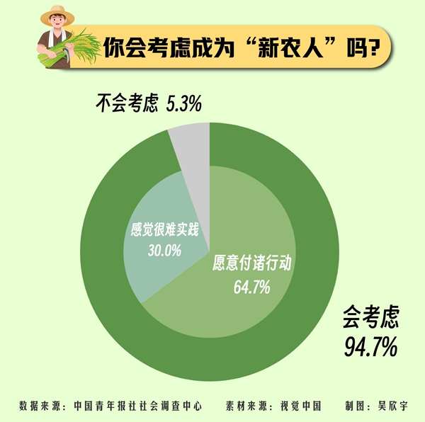 数据显示,随着农业现代化的推进,94.7%的受访青年会考虑成为“新农人”,其中64.7%的受访青年愿意付诸行动。