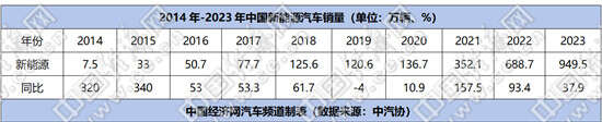 据中国汽车工业协会数据,2014年,中国新能源汽车销量约7.5万辆,到2023年攀升至949.5万辆,占到全球新能源汽车销量六成以上。今年以来,新能源汽车的市场表现依旧强劲,1-8月产销分别完成700.8万辆和703.7万辆,同比分别增长29%和30.9%,占比37.5%。