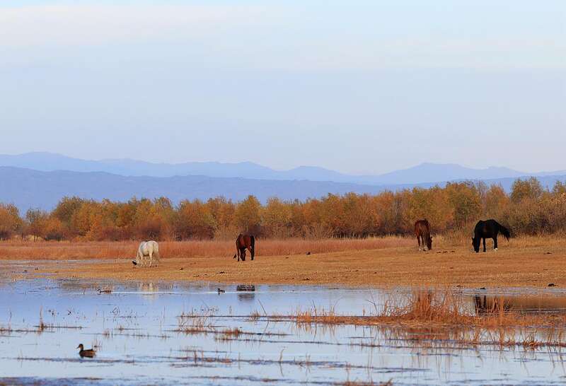 新疆阿勒泰地区额尔齐斯河沿岸风光壮美,与阿尔泰山脉并称为“金山银水”。秋日的额尔齐斯河河谷中,马儿自在地吃草,候鸟惬意飞翔,金黄色叶片挂满了树林,正是一幅美不胜收的秋日画卷。