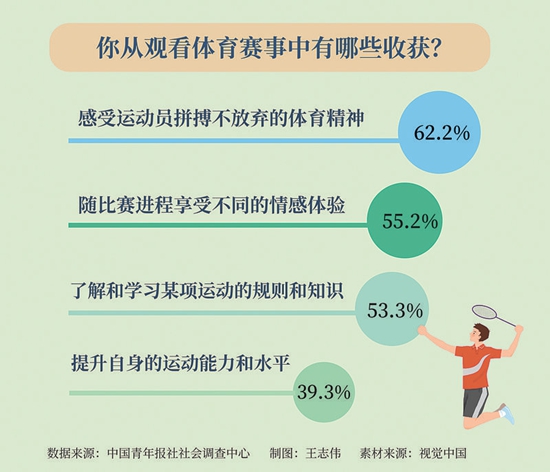 “我是个体育迷,对很多体育项目都比较感兴趣。”苏州的90后陈凯说,自己在大学期间喜欢看足球比赛,经常熬夜看欧冠。工作后,没办法熬夜看球,渐渐地就不再关注足球比赛了。这几年,他更关注国内运动员在赛场上的表现,像乒乓球运动员樊振东、王曼昱,网球运动员郑钦文等,如果时间方便,会收看他们的比赛。