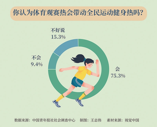 调查显示,75.3%的受访者认为体育观赛热会带动全民运动健身热。