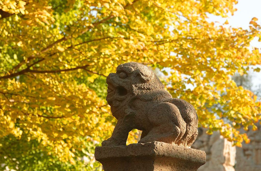 北京五塔寺百年银杏金黄灿烂 石狮昂头“望”秋色