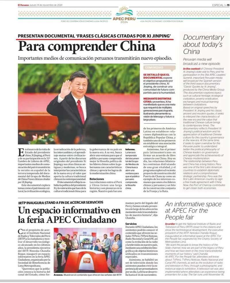 △《秘鲁人报》刊发文章《<平“语”近人>专题片播出 更好地了解中国——秘鲁各大媒体播出新一季片集》