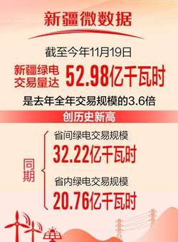 天山网-新疆日报讯(记者陈蔷薇报道)记者从国网新疆电力有限公司获悉:截至11月19日,今年新疆绿电交易量达52.98亿千瓦时,是去年全年交易规模的3.6倍,创历史新高。
