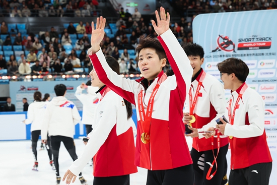 12月8日,2024-2025短道速滑世界巡回赛北京站,中国队夺得男女2000米混合接力金牌。图为作为中国队主力队员之一的范可新在颁奖仪式上向观众挥手致意。视觉中国供图