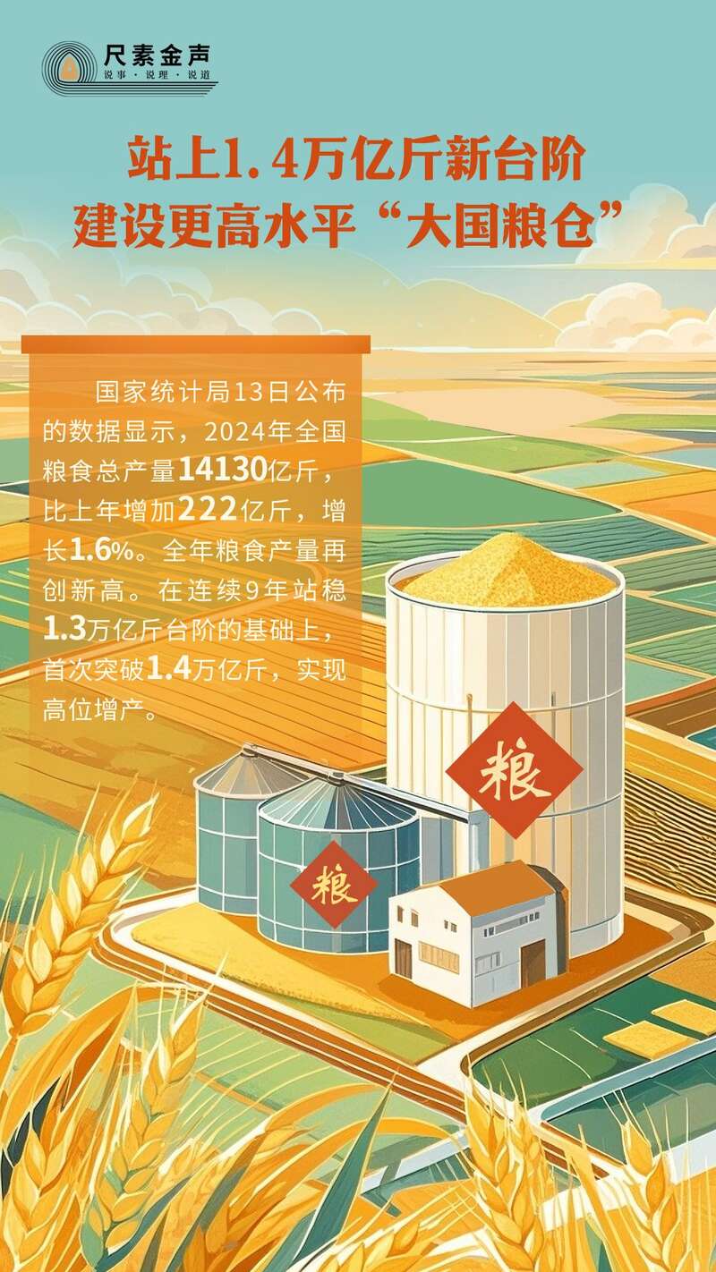 国家统计局13日公布的数据显示,2024年全国粮食总产量14130亿斤,比上年增加222亿斤,增长1.6%。全年粮食产量再创新高。在连续9年站稳1.3万亿斤台阶的基础上,首次突破1.4万亿斤,实现高位增产。