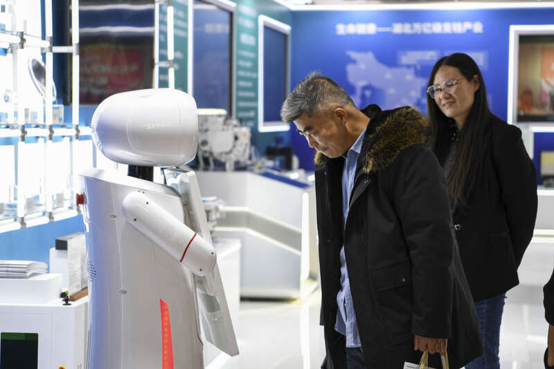 11月27日,参观者在第二届中国国际供应链促进博览会主宾省湖北展台与智能机器人互动(2024年11月27日)。新华社记者 张豪夫 摄