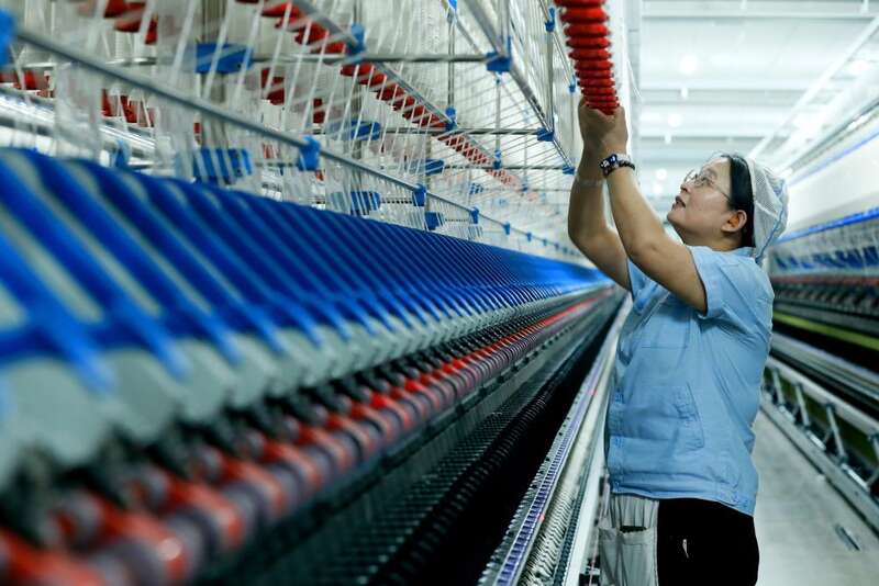 12月12日,青岛即发纺织科技有限公司的工人在智慧纺纱生产线上生产高端纤维(2024年12月12日)。新华社发(梁孝鹏摄)