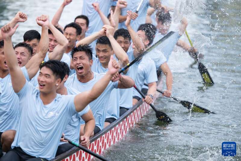 2024年6月10日,参赛者在2024澳门国际龙舟赛中庆祝。