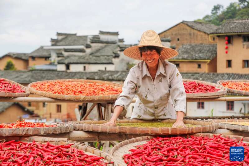2024年9月22日,安徽省黄山市歙县阳产村村民在晾晒收获的农作物。
