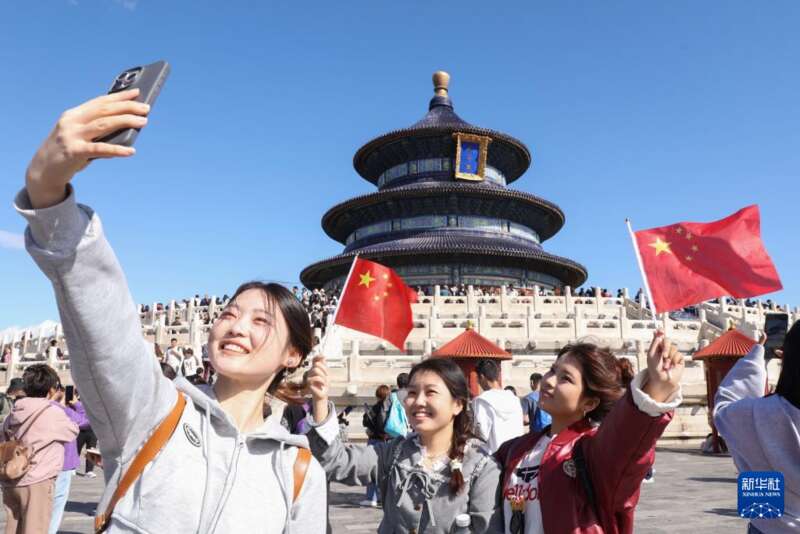 2024年10月1日,游客在北京天坛公园祈年殿前拍照留念。