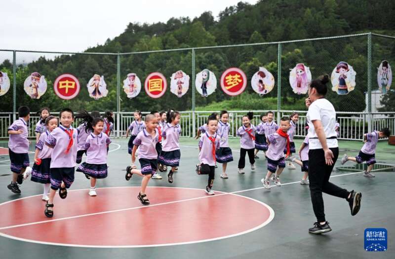 2024年6月26日,广西桂林市龙胜各族自治县龙胜镇第二小学学生在老师指导下练习多耶舞蹈动作。