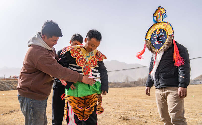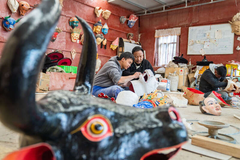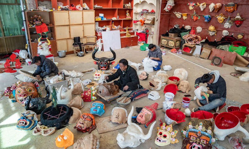 在拉萨达孜区雪乡民间传统手工艺农民专业合作社的小院里,西洛和徒弟们忙得热火朝天,他们正在制作西藏传统面具。面具制作工序繁杂,制作一个面具包括雕刻、分层、风干、喷漆等十几道工序,需要10多天才能完成。徒弟们各司其职,西洛紧盯徒弟们的一举一动,不时上手帮忙,力求每一张面具都能完美出品。