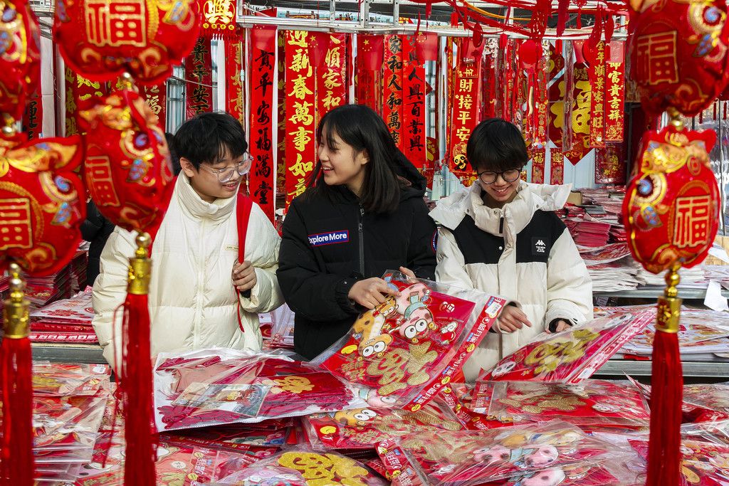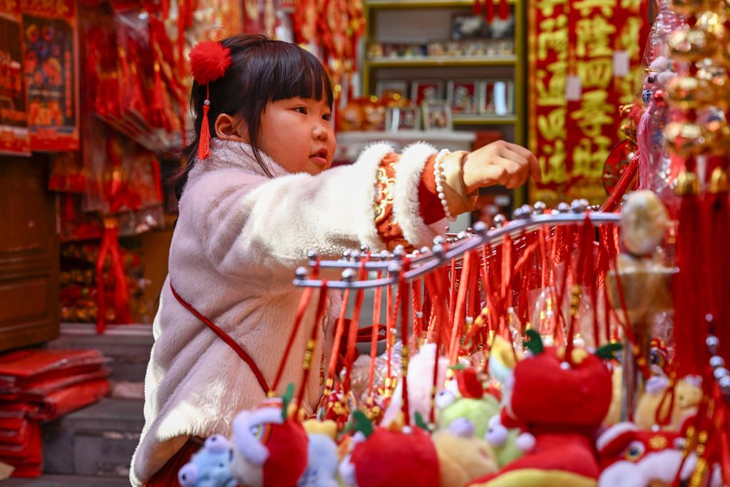 2024年12月29日,元旦、春节临近,新年饰品火红上市,增添了节日气氛,吸引不少市民前来选购,让年味更浓。