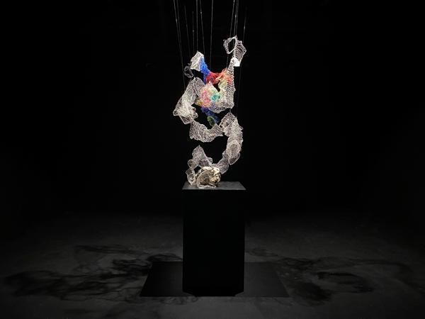 在王家琳眼中,中国山水和中式园林,是体现中国含蓄美的元素,在系列作品《自我沟通》中,她将中式山水的自然形态与西方艺术中对人体结构的美学相结合,以人体形态和肌肤质感为灵感,创作出一系列作品。在材料和形式上,王家琳尝试加入彩色玻璃、铁制品、铜制品等不同材料,将它们融合在陶土的素坯里,尝试进行不同温度的烧制。表面裂痕与开口的设计,象征着与内心情感的对话。而假山元素的坚硬与人体肌肤所展现的柔软,映照着陶瓷“坚硬而又柔软”的特质。
