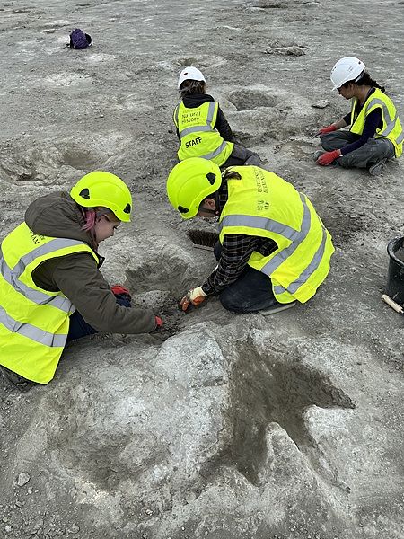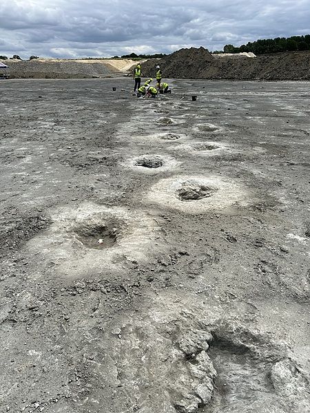 来自牛津大学和伯明翰大学的研究人员表示,在杜瓦农场采石场的挖掘中发现了五条宽阔的足迹,其中一条长度超过150米。图为当地时间1月2日,研究人员在英国南部牛津郡的一个采石场发现的恐龙脚印。