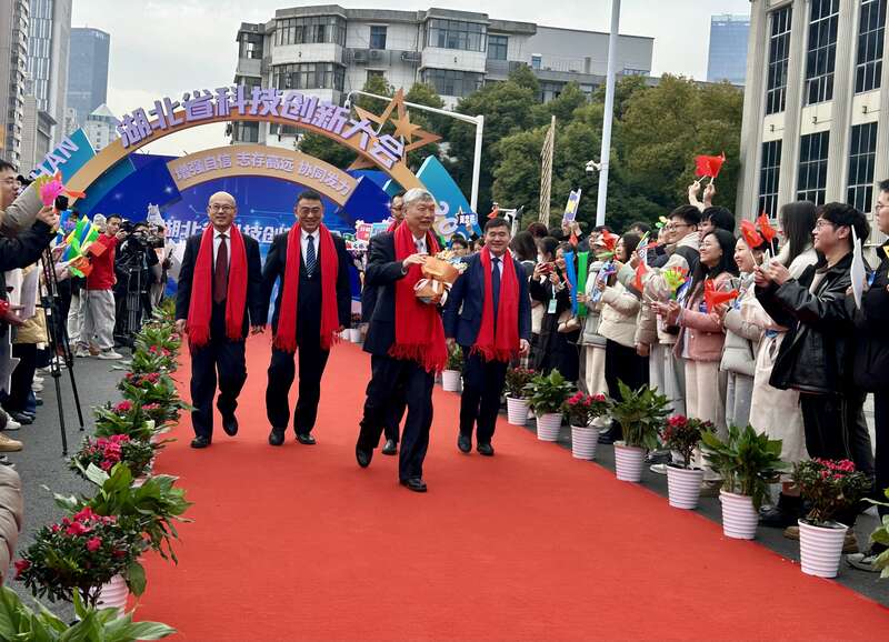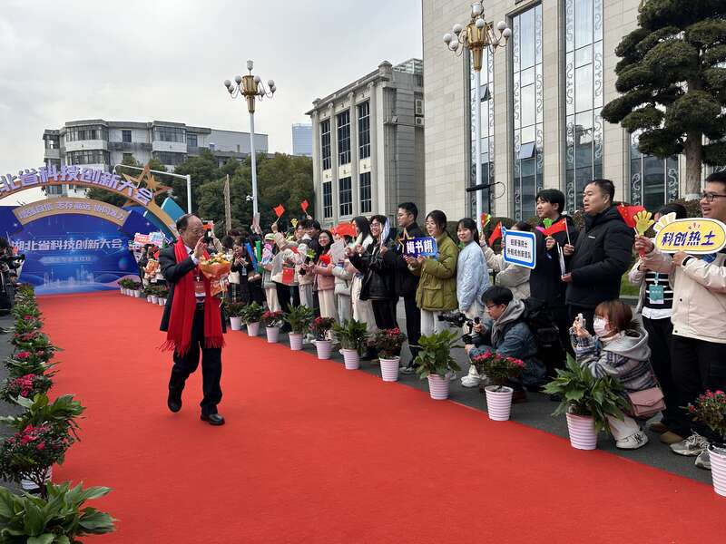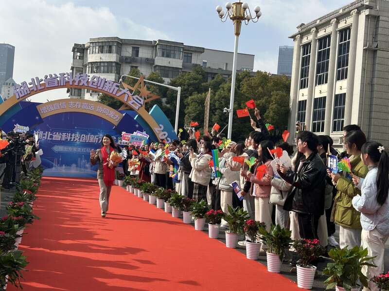 一条近百米的红毯从马路一侧延伸至会场,10位院士专家戴着红色围巾,一一款步走过。红毯两侧,鲜花簇拥,挥舞“追星牌”的粉丝团掌声如潮。这是1月6日,2025年湖北省科技创新大会特别环节——“院士专家走红毯”的现场。