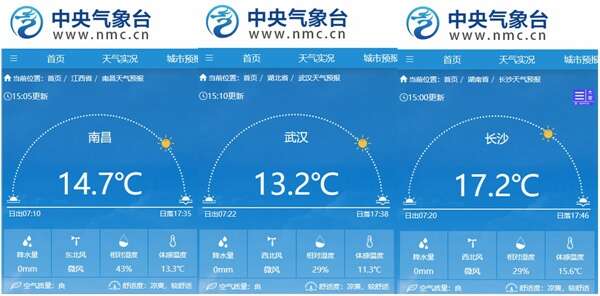 今天白天,长江中下游不少地方气温偏高仍较为明显。今天下午截至15时的最高气温来看,长沙、南昌、武汉三地的气温较常年同期偏高了5~9℃。