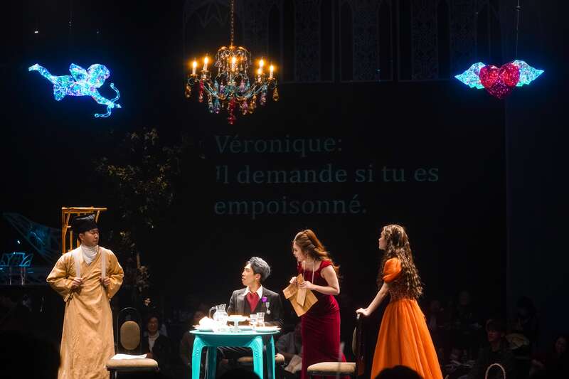剧场内,观众的坐席被推平,灯光、舞美与多媒体动画相互呼应,剧场空间被打造成一个“童话法式府邸”。观众落座于吧台与蒲团之间,被开放式的“四面台”环绕,近距离感受演员的每一幕表演,剧场工作人员则化身服务员穿梭其间。