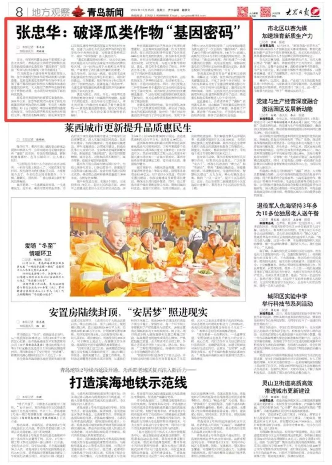 大众日报报道了园艺学院院长张忠华教授因破译瓜类作物“基因密码”,荣获2024年度何梁何利基金“科学与技术创新奖(青年创新奖)”。