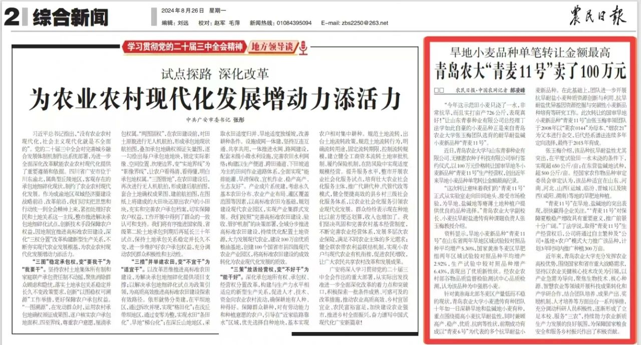 《农民日报》报道了青岛农业大学旱地小麦新品种“青麦11号”以100万元成功转让。