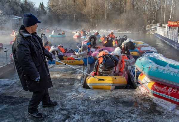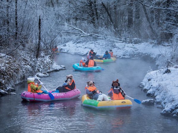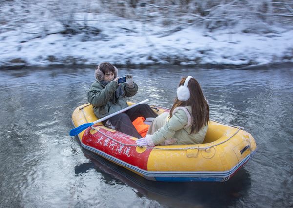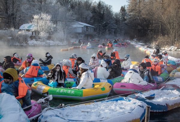 2025年1月7日,吉林省延边朝鲜族自治州安图县二道白河镇大泉河畔,雪凇与雾凇相映成趣,旖旎风光吸引了众多游客前来体验冬日漂流乐趣。